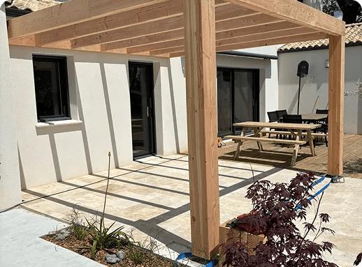 Magnifique terrasse sur une maison neuve de plein pied avec la création de cette pergola sur mesure.